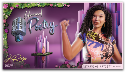 Unreal Poetry features the fabulously talented J Rose from @TheRoseGardenEvents like never before. Check out her inspired pieces “Starving Artist” and “Bones”, as J Rose takes the stage in the crossroads of 3D animation, and spoken word poetry.